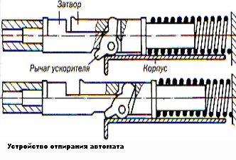 В оружии с коротким ходом ствола затвор отпирается уже после непродолжительного движения ствола. Для того чтобы в достаточной мере ускорить движение затвора после отпирания ствола, в механизм встраивают так называемые ускорители.