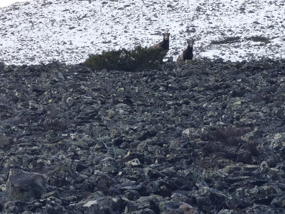 И вот в конце июля, на одном из перелетов с участка на участок, вместе с продуктами пилоты передали мне путёвки. С 1 августа, на горного барана и сагжоя, а с 1 сентября на сохатого. За полтора месяца мне часто приходилась видеть в верховьях ручьёв, на не больших заболоченных лугах, которые окружал цирк из скальника и курумов, маленькие следы, чуть крупнее чем у косули, но в живую баранов не видел, и особо не надеялся их встретить. К своему великому удивлению 2 августа, забравшись в одно из таких мест я заметил как метрах в 300 от меня паслось стада баранов, которое тоже при виде меня начало удаляться в верх по горе, подойдя на 250 метров(измерено по джпс) я сделал дрожащими руками один выстрел, который принес не большого баранчика и трофей о котором я даже не мечтал