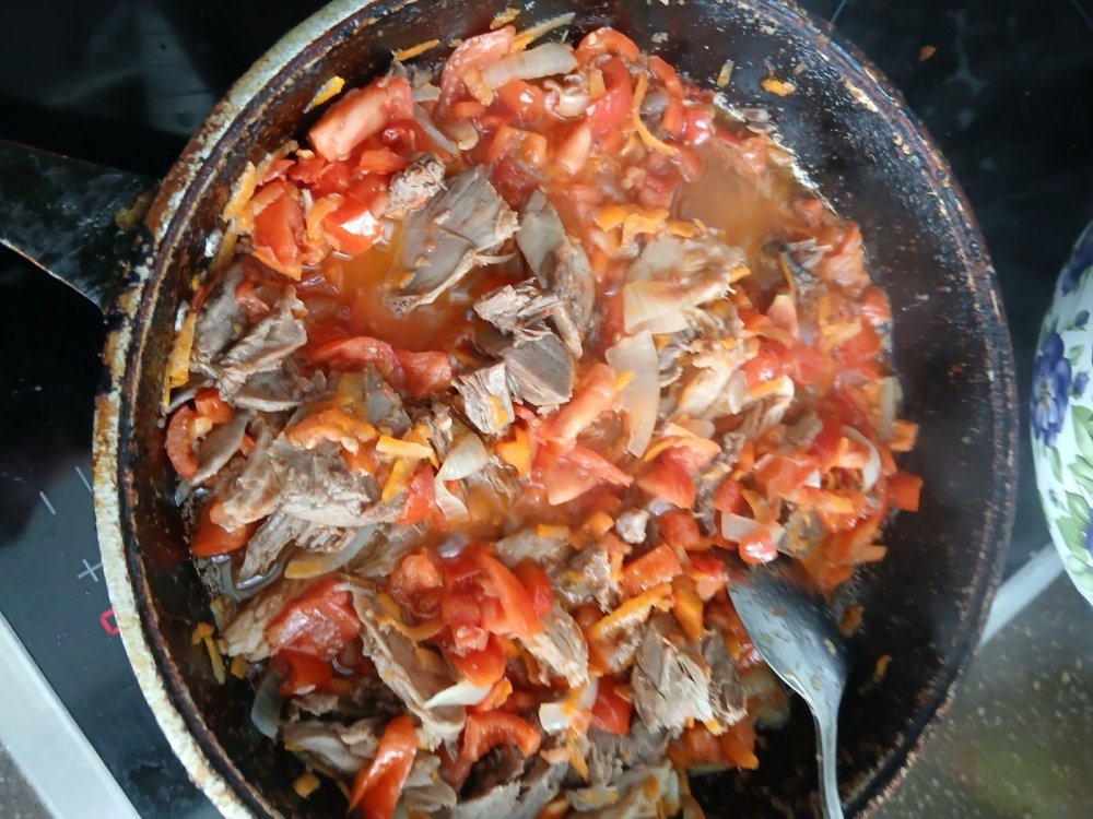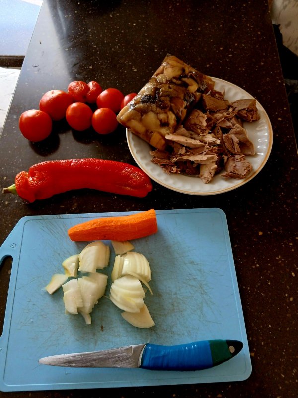 Осень золотая пора, на огороде всё прибрано и уложено в закрома, в морозилке появляется дичинка и есть возможность поколдовать на кухне. Сегодня готовил суп из домашних овощей с косачишкой)Отварил петуха с парой долек чеснока, дал остыть и подготовил ингредиенты,лук, морковка ,помидоры и пару стручков перца,один сладкий,другой острый,именно острый а не жгучий.далее режу помельче мясо и обжариваю на масле с лучком и морковкой,добавляю туда презанный перец и помидоры и тушу минут 10