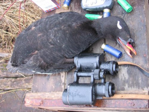 Турпанов все не было, преобладали морская и хохлатая чернеть. Несколько раз пролетали гуси, и мы добыли трех гусей. Вечером 2 июня наконец-то появились гагары – предвестники турпанов. Поздно вечером мы добыли первых турпанов – эффектных иссиня-черных красавцев с горбатыми красно-желтыми носами и алыми лапами. Солнце, не успев скрыться, снова показалось на горизонте. Сквозь лохмотья тумана высоко на небе этажерками пролетали стаи турпанов. Вдруг, тормозя растопыренными крыльями и выставив вперед красные лапки, на манки начали сыпаться турпаны. По всему озеру прокатилась канонада выстрелов, прерываемая радостными возгласами охотников. Началась охота на турпанов.