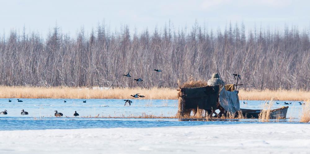 Вечером небо затянуло тучами, поднялся сильный ветер. На озере появились белые барашки, манки начало сносить порывами ветра. Несмотря на высокие волны, два Сергея, Саша и Денис, оседлав верткие ветки, начали собирать унесенные ветром манки. Низко над озером, с трудом преодолевая напор ветра, пролетели турпаны. Следом за ними захлопали выстрелы. Вот это да! При такой качке стрелять с лодки может только очень опытный гребец или безбашенный удалец.