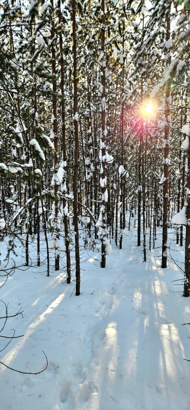 Солнце предательски слепит, взобравшись в эти утренние часы февральского дня уже по-весеннему высоко, и всё больше проявляясь меж густососедствующих молодых тонких сосен, являя себя спящему лесу запутавшимся где-то в переплетённых ветвях макушек хвойных красавец, обронив ясные тонкие лучики света в затенённые заросли и подсветив недавно натоптанный зайцем путь...
