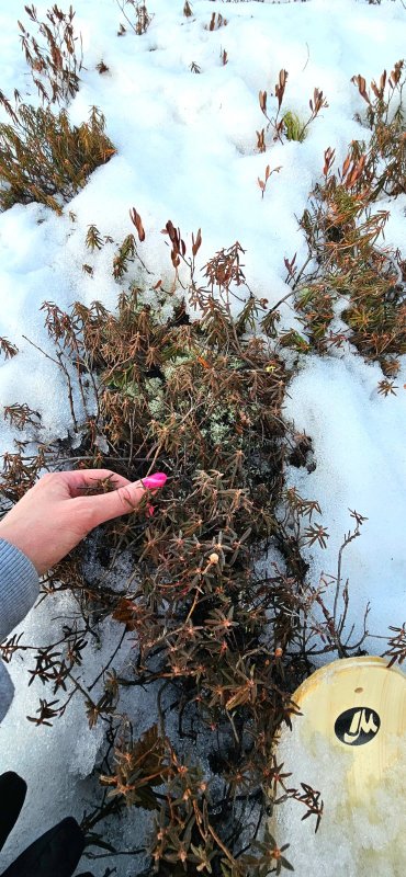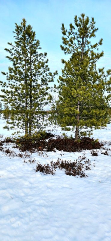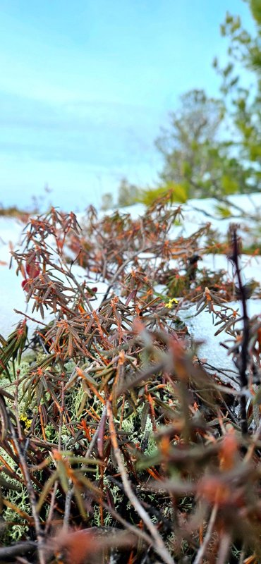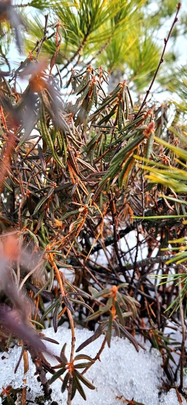 Привлекли меня издали тёмные пятна на вершинах возвышений под деревьями. Чем ближе подходила, тем сильнее проявлялась весна! Снег под пушистыми хвойными почти растаял, но и этого хватило, чтобы обнажить мох и багульник.