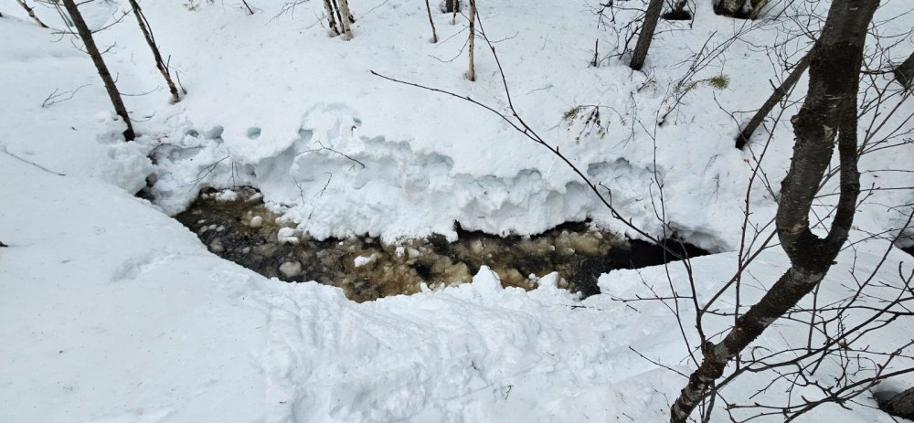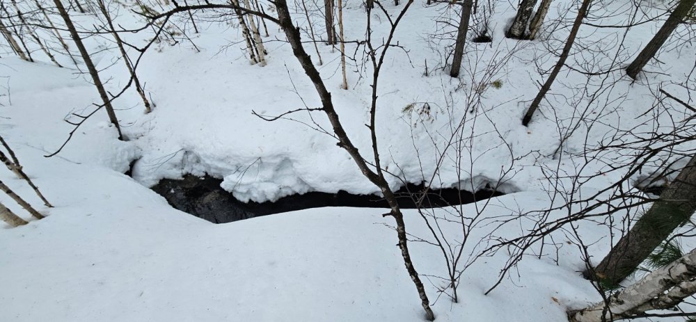 Снег частично сполз вниз, добравшись до ручья, в котором уже не спешил растворяться - видимо, мы хорошо охладили воду до этого. Посему приняли решение прекратить работы и возвращаться в город.