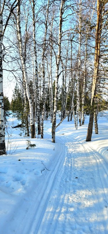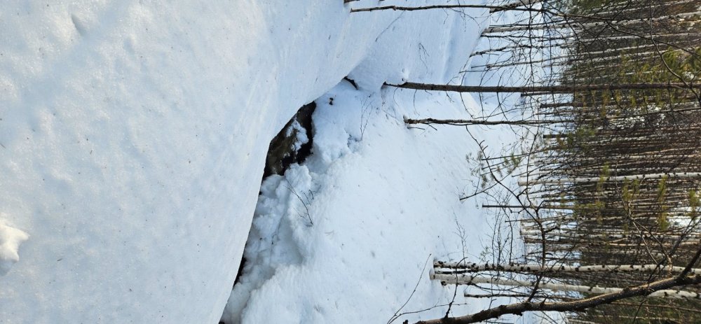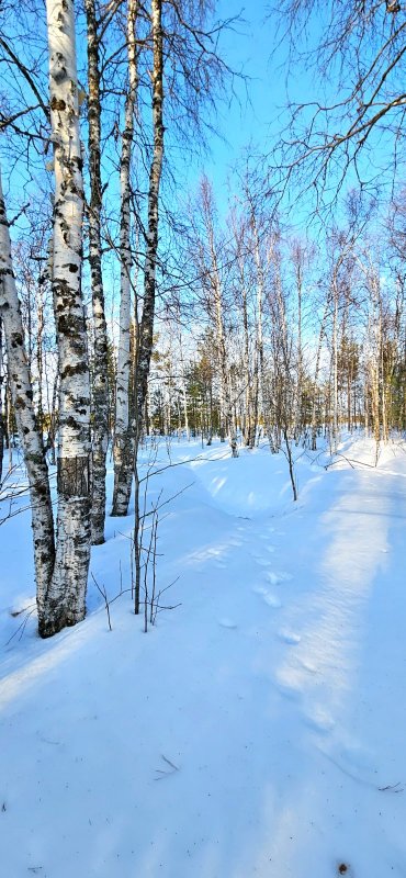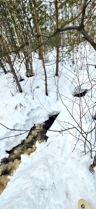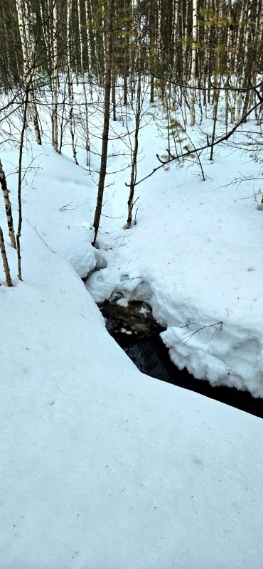 Пока остальные ходят-бродят по Ямалу, леностно ждут, когда весна к ним придёт, я иду к весне сама! Добралась пару дней тому назад до любимого ручья в небольшой березовой роще. Он уже вскрылся! Правда большого течения ещё нет, вода почти стоит. Глубина здесь 4-5 м. Кругом следы зверей и птиц. Там, где деревья нависают меньше, снег почти растаял над водой, а в теневых зарослях будто и нет вовсе ручья - сплошное белое поле средь бархатных своими чёрными штрихами красавиц - вот так будешь не знать, что под лёгкой снежной шапкой, сунешься и привет!