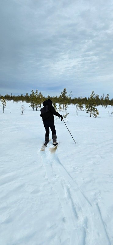 Дальше мы вынуждены были выбираться вместе. Не то, чтобы у нас прям сложилась компания, просто дорога была одна. Это путь, накатанный некогда снегоходами, но давно оставленный, поэтому если я шла и изредка проваливалась на нем буквально на глубину двадцати сантиметров, то охотник в сапогах постоянно уходил в сугроб до бедра. Он никак не выдавал своих мучений, это я, периодически поворачиваясь, чтобы убедиться, что там всё в порядке (всё же на мне отныне ответсвенность), замечала провалившегося на метр-полтора путника, который мгновенно, как замечал моё внимание, мастерски делал вид, будто так и надо, отчего я заливалась смехом на всю тайгу! Он то театрально начинал закуривать сигарету, смастерив задумчивый и отстранённый взгдяд, то что-то, не нуждающееся в этом, поправлял, то вдруг задирал голову и начинал любоваться солнцем или наблюдать за пролётом мимо суетящихся сорок. Зверолов ушёл в тайгу по ещё затвердевшему насту несколько дней назад, а теперь возращается, пока тропа вовсе не растаяла.
