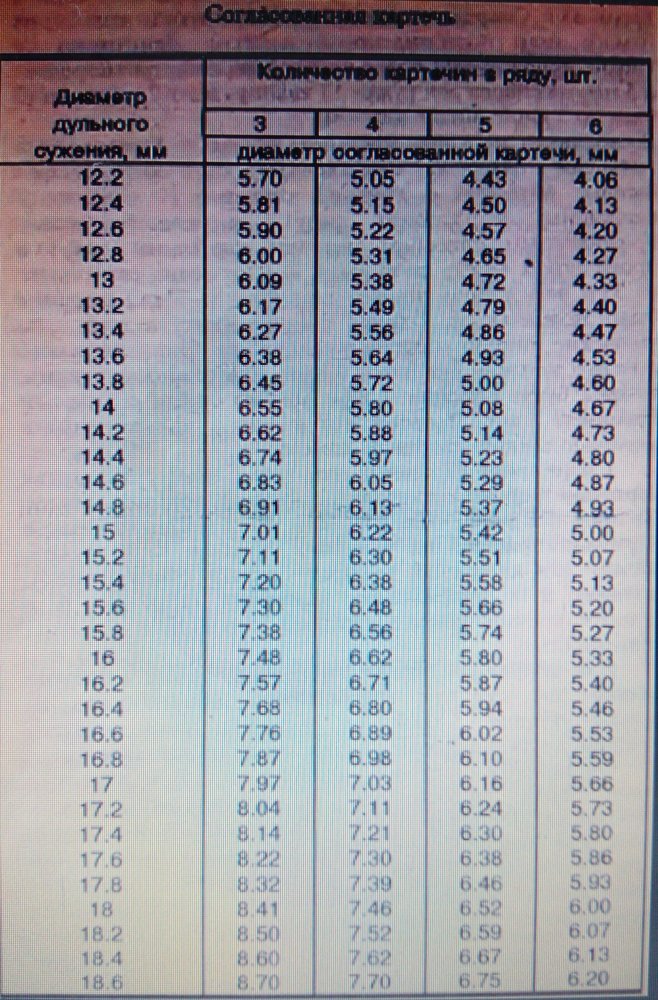 Таблица по большому счету и не нужна, досылаешь в д/с пыж на небольшую глубину и подбираешь картечь, желательно с пленкой, которая будет предохранять картечь от истирания. Но не только это влияет на кучность картечного выстрела.[/QUOTE] Абсолютно с вами согласен. Я так и подобрал картечь 8 мм. С верхнего с сужением 1,25 мм.