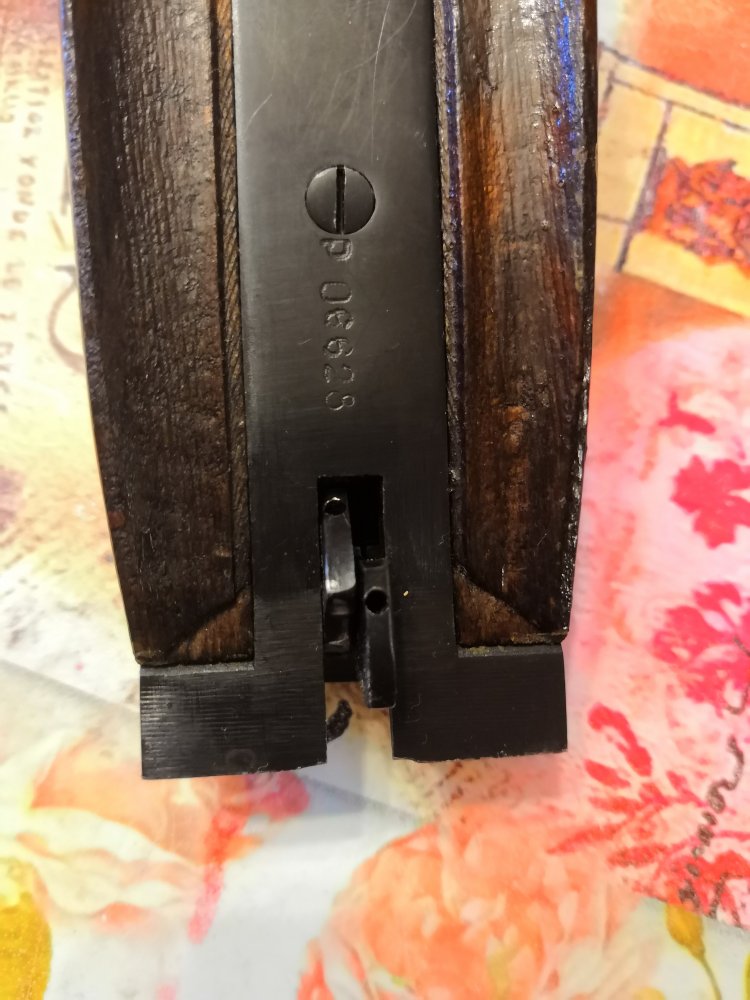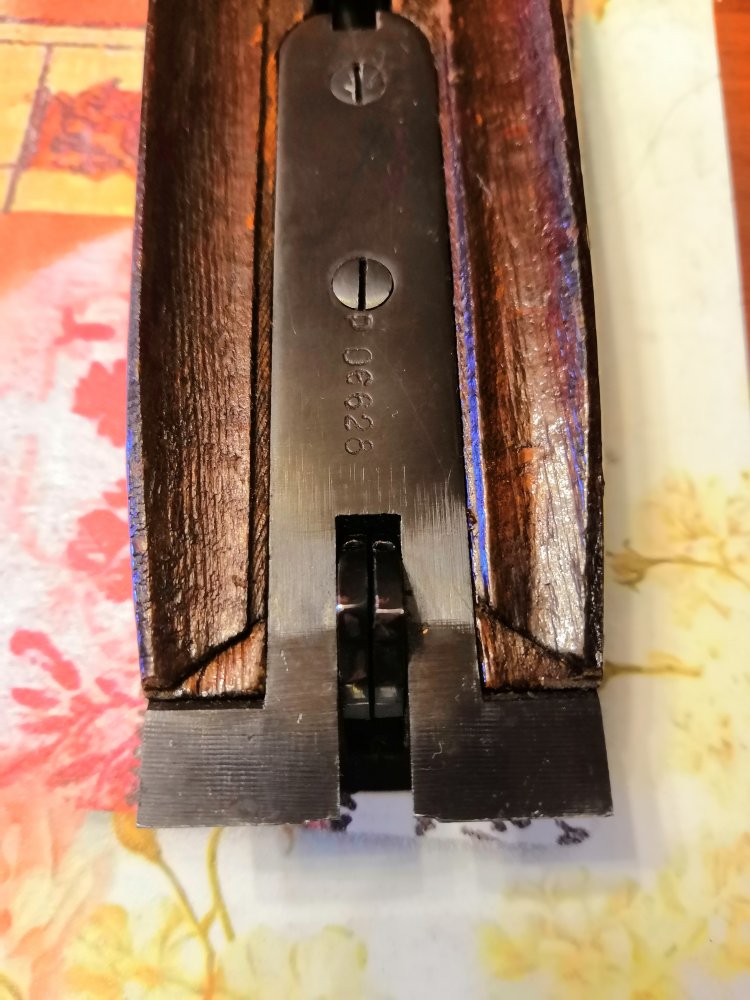 Открутите болты, выньте металический шарнир из деревянной части цевья и все увидите.
