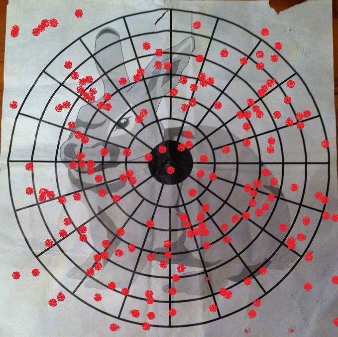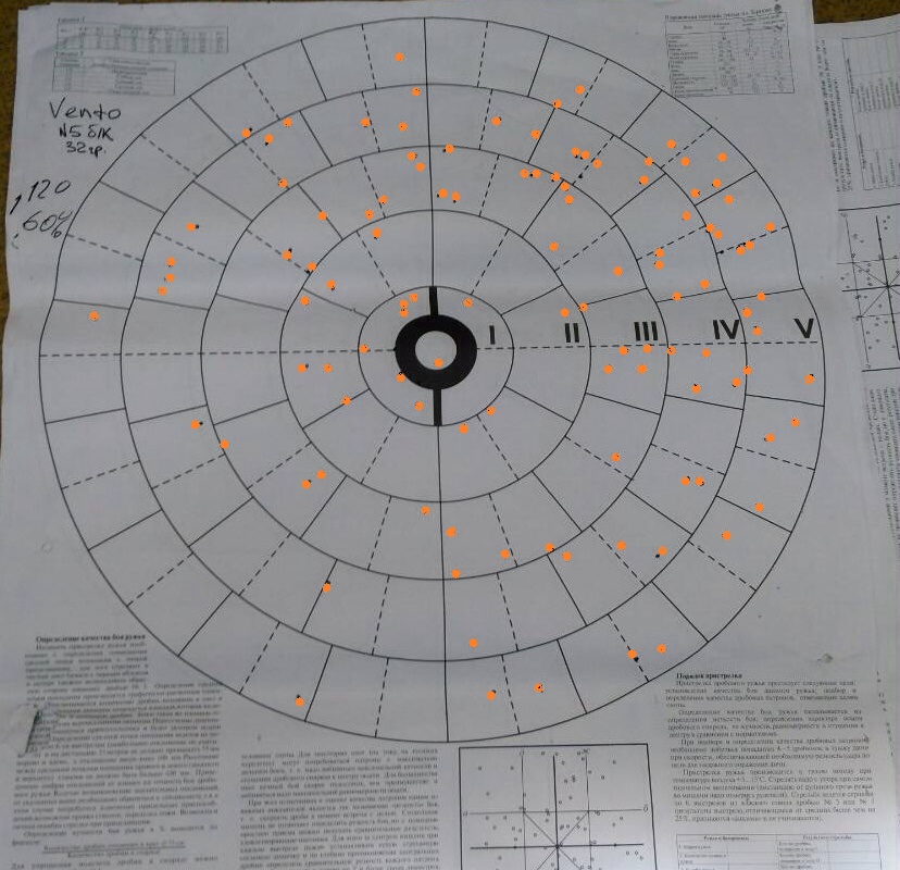 Бой того же ружья МР-153, д/с 0,5мм, НО патроны Феттер Венто (3-ка) и Азот Практик (4-ка), бесконтейнерные. Не совсем понимаю как с таким боем можно что то добирать осмысленно на воде, да и вообще что то добывать. Д/с 1,0мм дает еще более скучные результаты на 3-ке, с твердостью 20ед. и ниже. И это не снос осыпи, т.к. показатели кучности вполне в норме. Осыпи патрона Азот показывают, что у ружья отсутствует постоянство боя по равномерности. Напоминаю, патроны бесконтейнерные.