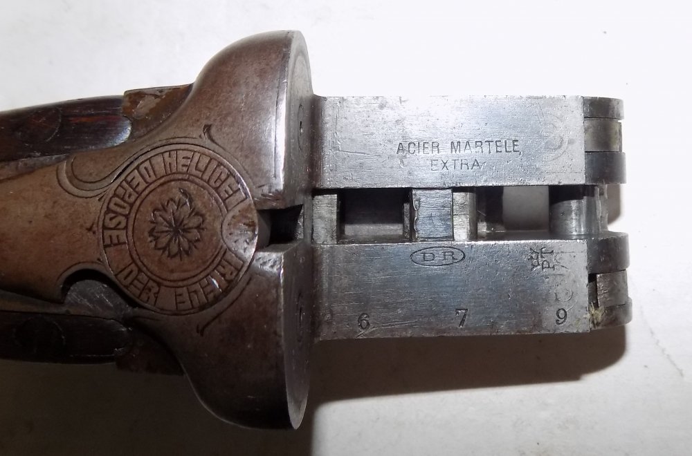 @500, надпись A_BOBET a BONNEVAL начертанная золотыми литерами на нижней личине, марка торговца из Бонваля. Изготовители вероятно оружейники с фамилиями Котэ и Мари. COTET&MARY CANONNIERS. Хотя CANONNIERS могжет быть означает и ствольщики, изготовители стволов, а ружьё в целом собрала фирма, чьё клеймо в виде овала с буквами кажется X.SASSGN виднеется на подушке коробки. Есть ещё какие-то зачириканные клейма . А на подушке правого ствола ещё овальное клеймо, похожее на клеймо на коробке..