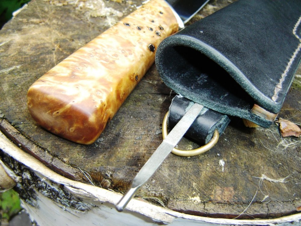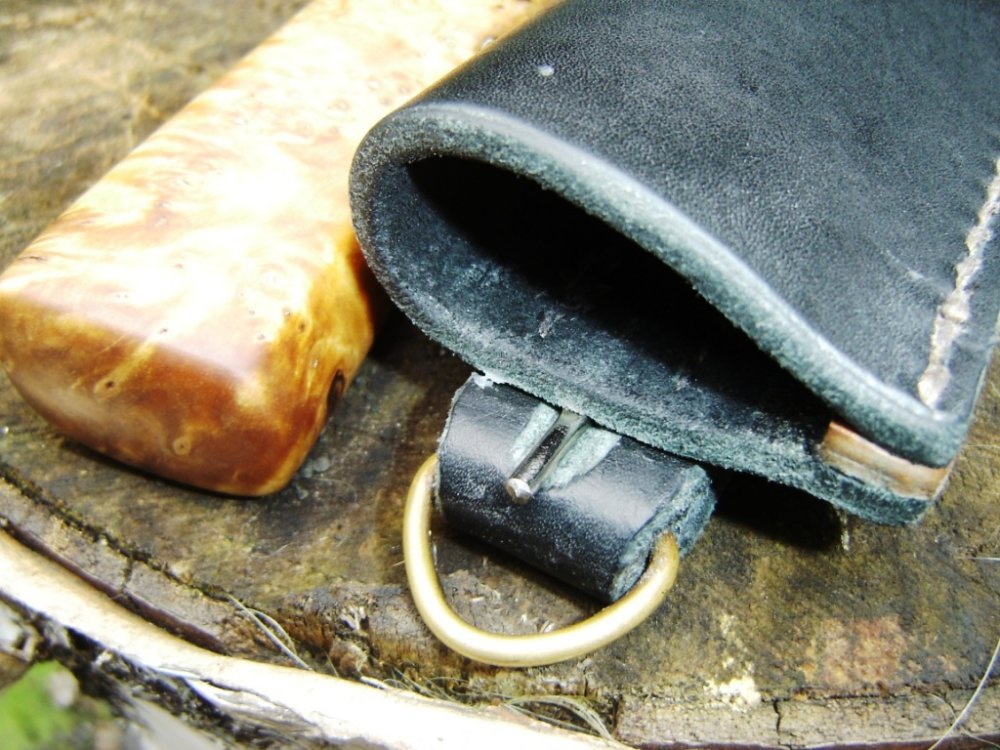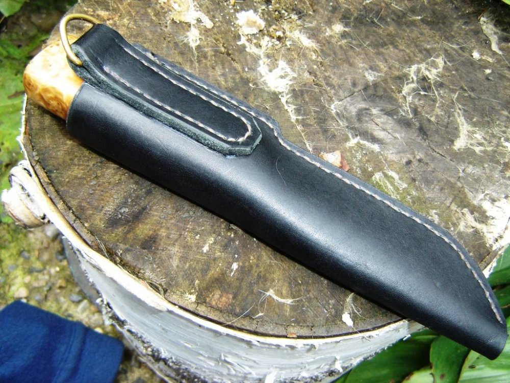 DSC07798.JPG DSC07797.JPG DSC07796.JPG DSC07792.JPG DSC07791.JPG Сделал ножны.Сильно не старался-нож в работу.Из антиреса сделал только вставку из кожи другого цвета.Придумал фишку -сделал кармашек для алмазного надфиля.Поскольку такие ножи я не ношу на поясе-подвес делать не стал.Но на всякий случай-крепление под него пришил.