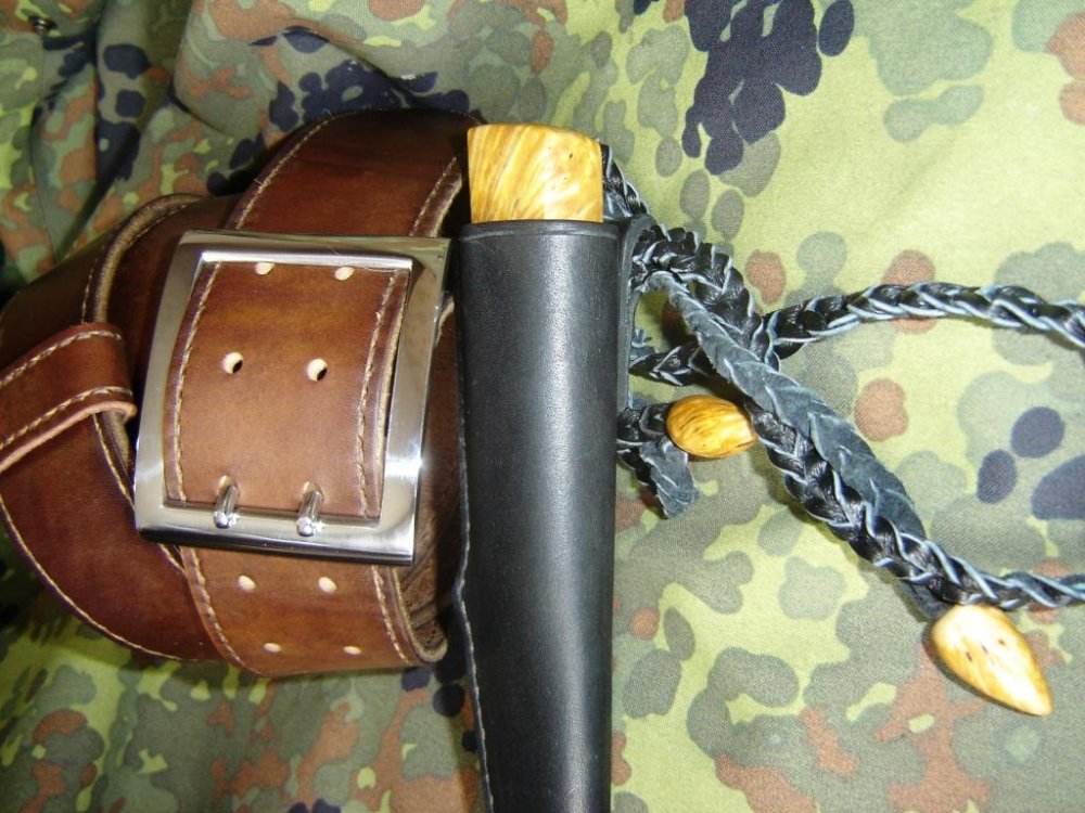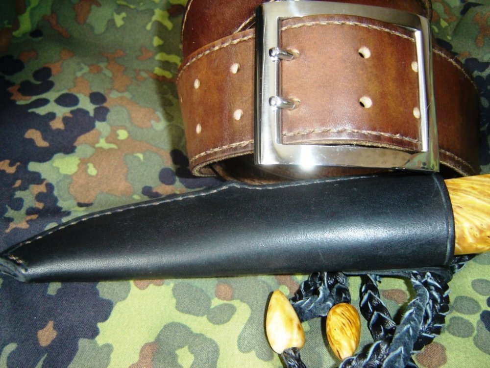 Дошкрябал ремешок.Реально шкрябал-из покупного только винты и кожа.Буйвол.Перестарался с брутальностью-при ширине в 5 см-мало в какие штаны лезет.Сделал и ножны для предыдущего шейника..