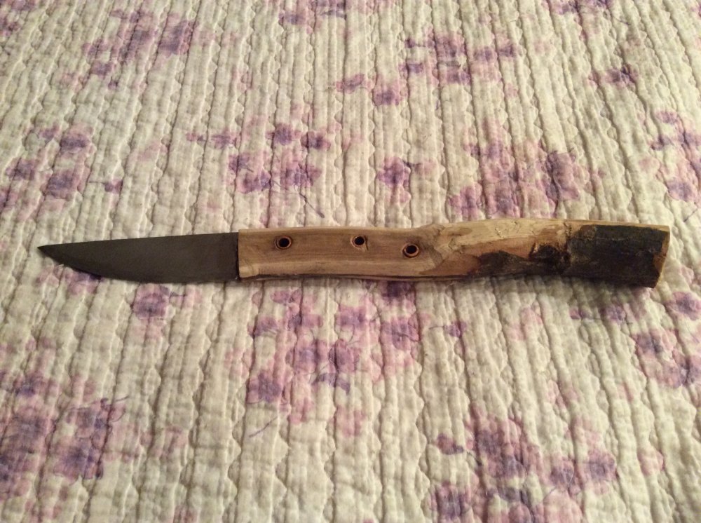 Лезвие часть быстрореза, ручка дуб сушёный, посажена на эпоксидку + три дырки с медными трубками, находится ещё в работе)))))