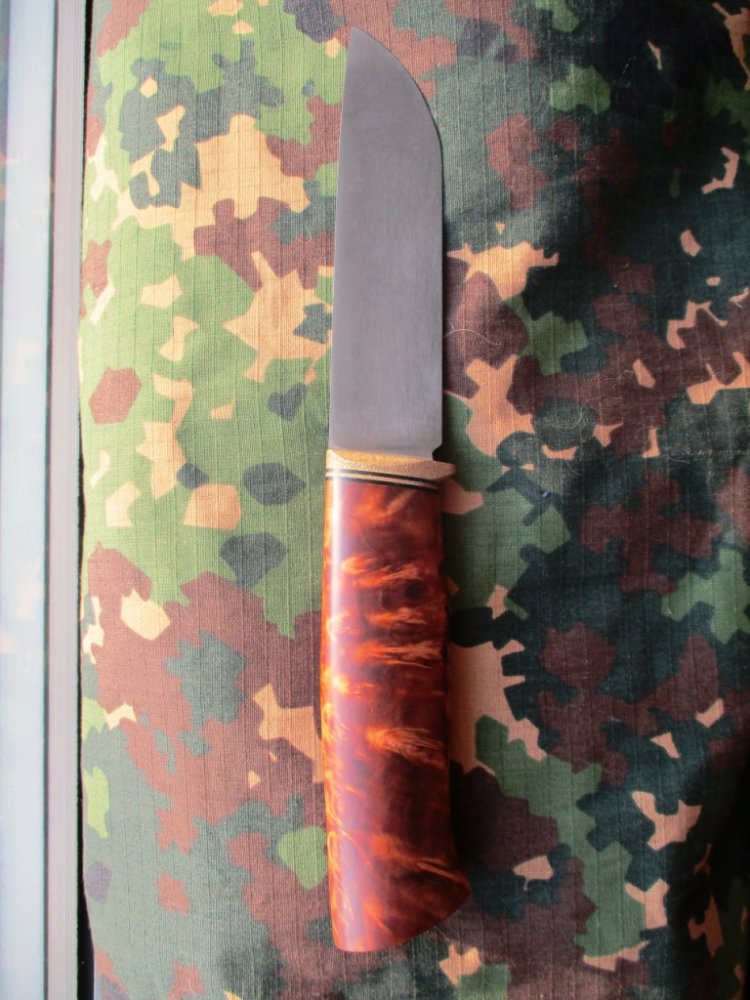 Всем привет, новенького доделал для хорошего человека. Сталь н690, 110х30х2.6 мм, рукоять 115 мм из стабилизированной карельской берёзы и вставка из рога лося, ножны кожа. IMG_20191216_151638.jpg IMG_20191216_151601.jpg IMG_20191216_151621.jpg IMG_20191216_151608.jpg IMG_20191216_151717.jpg