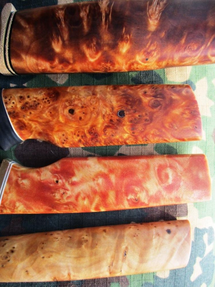 Эксперемент.Как узнать где лучше а где хуже когда всегда делать одинаково?Вот на фотке где четыре рукояти выложенно-две-эксперементальные.Одна(третья сверху)тоже эксперементальная-но результат очень хорош.А эта сверху-согласен,перетемнена.Но поскольку нож и задуман и сделан как утилитарник и учитывая что из очень доброй стальки-думаю найдёт своего хозяина.Ну а нет-не беда-мне останется.Я не парюсь.