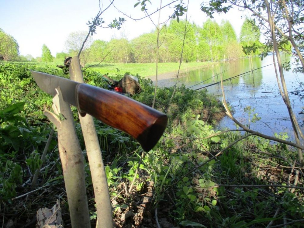 Повторение - мать учения)) Попросили повторить эту работу https://vk.com/nikolayknife?w=wall-65191364_539/all но с небольшим изменением длины рукояти (даже рукояти выполнены из одного куска кавказского ореха), получилось следующие: -бланк клинка из Elmax, распил от Alexeyzp, от Алана Баликоева с обработкой холодом (крио), твердость 61-62 HRC. Длина клинка 127 мм, толщина клинка у больстера 3,4 мм, к острию на слабый клин, ширина клинка у больстера 27 мм, спуски от обуха до 0,2 мм, финиш клинка поперечный сатин. -рукоять выполнена из корня кавказского ореха, больстер из латуни дятлинг, покрыт патиной, длина рукояти 122 мм, рукоять пропитана тунговым маслом, монтаж всадной, длина хвостовика 90мм. -ножны из кожи растительного дубления, тиснение, окрашены пропитаны, подвес свободный.