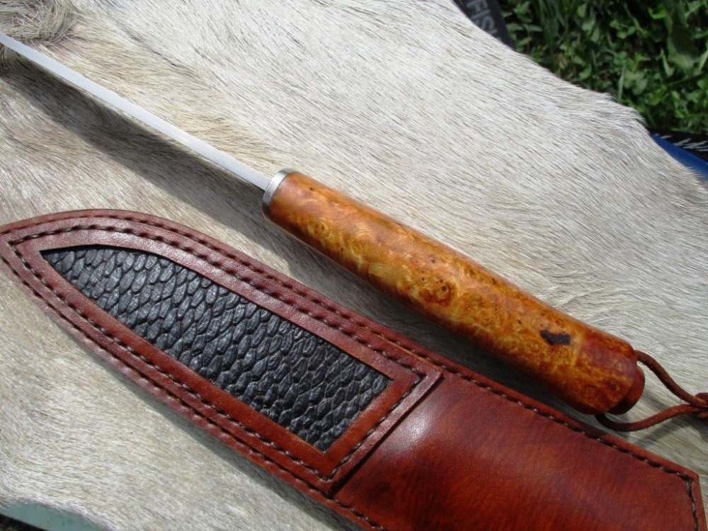 якутик, сталь х12мф, клинок 110х24х3 мм, рукоять 105 мм из капа клёна, ножны так же сделаны с вставкой из капа и кожи. IMG_20200821_234723.jpg IMG_20200821_234925.jpg IMG_20200821_235159.jpg IMG_20200821_235421.jpg IMG_20200821_235349.jpg IMG_20200813_182627.jpg IMG_20200814_132321.jpg IMG_20200814_184014.jpg