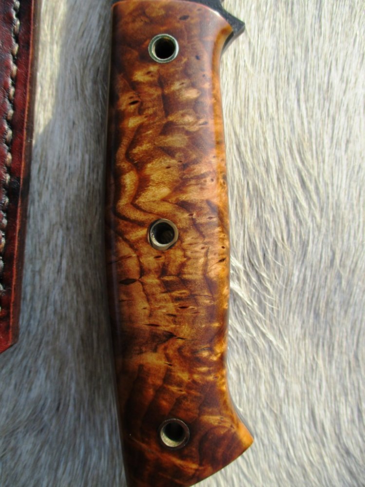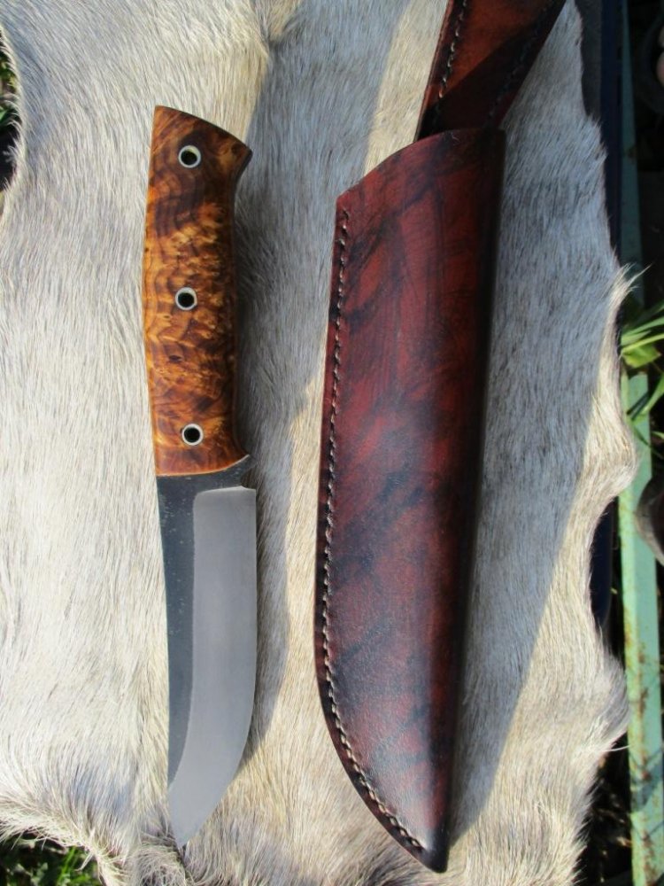 Всем привет. Новый нож допилил. Сталь к110, клинок 120х29х3.5 мм, рукоять 120 мм из собственноручно стабилизированного капа клёна, ножны из кожи