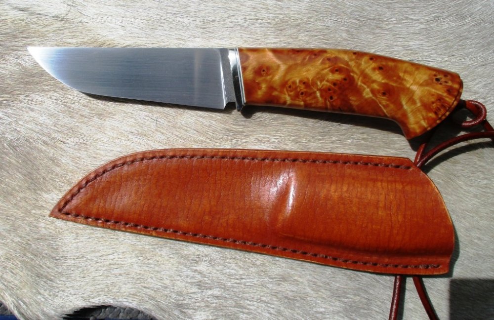 И ещё один режиг. Сталь cpm 15v. Клинок 122х26х4 мм, рукоять 118 мм из снейквуда, вставка бивень моржа, больстер нейзильбер, ножны из кожи.