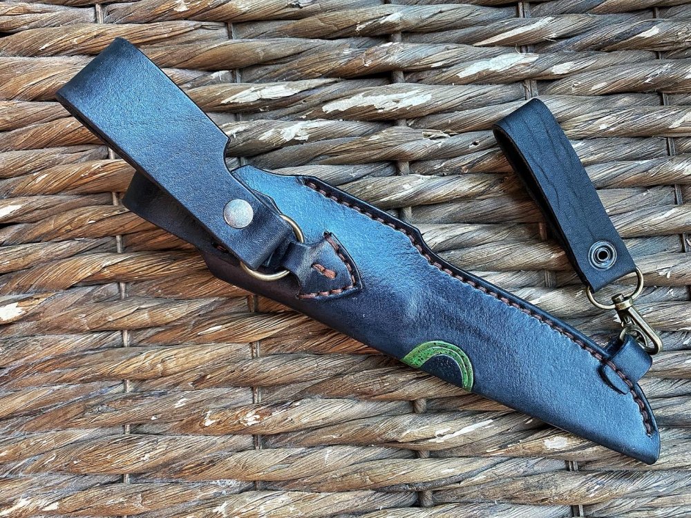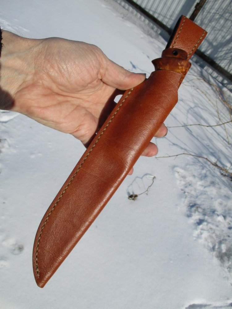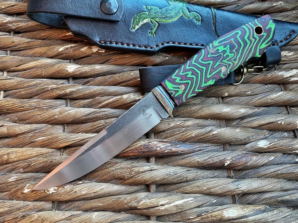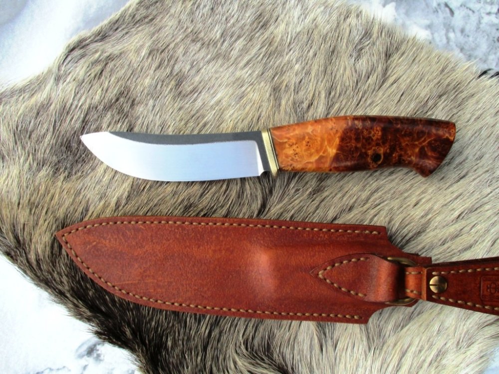 Сталь N690, клинок 125х32х3,5 мм. Рукоять 120 мм из гибрида сот, капа клёна и акрила, больстер нейзильбер, ножны кожа