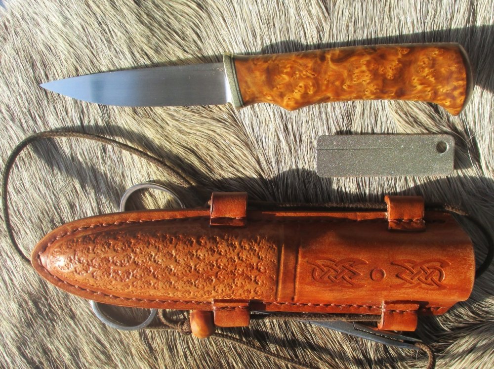 Самое моё любимое-ходовая рыбалка летом.В основном-хариус.Иногда-щука.Соответсвенно рыбу приходится присаливать,дыбы не прокисла.Соответственно большой нож мне не нужен.Кароч сделал под свои хотелки,сразу с точилкой для крючков в комплекте,зажим просто переставил с предыдущей версии моего ходового рыболовного шейника))))