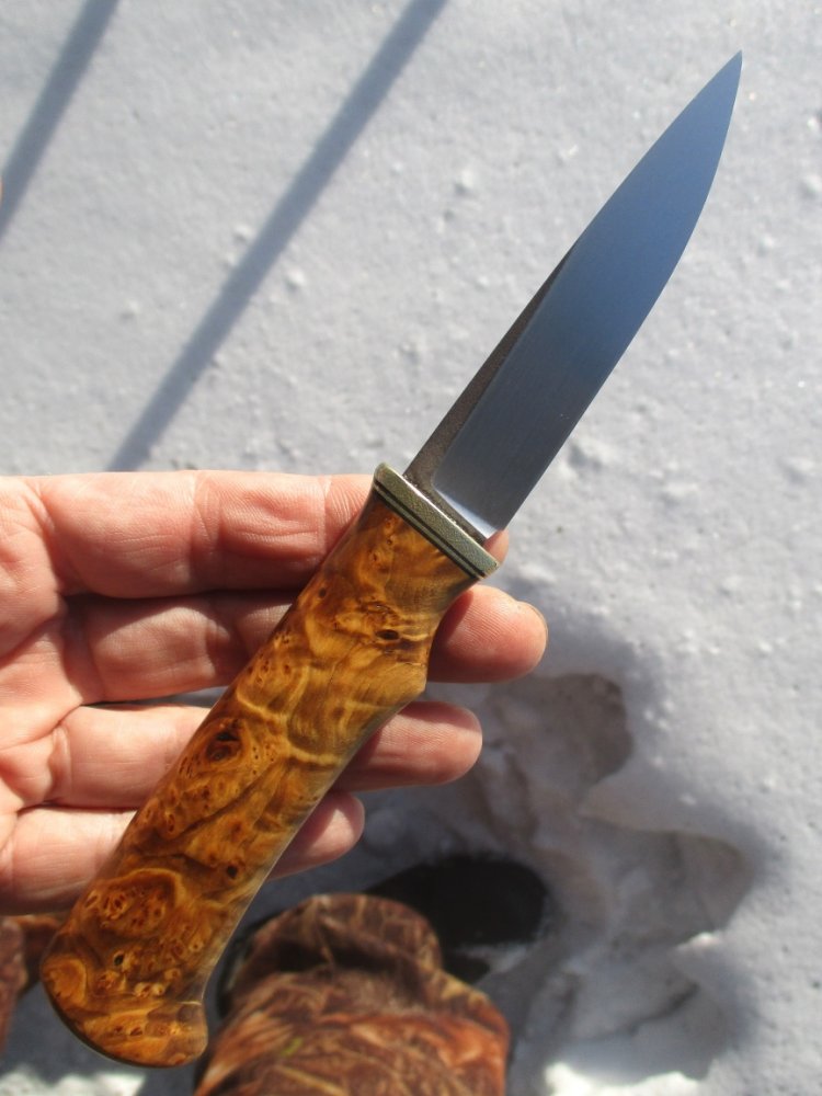 Клин-м390 -90мм рукоять-кап рябины(предпоследний кусок)-107мм.Сиська-для хвата вверх РК.Именно так я порю рыбу.
