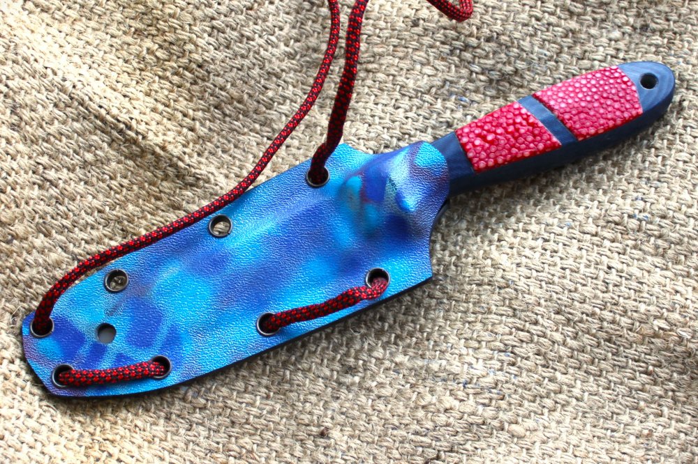 Сталь 95х18 с крио обработкой, 100х27х4 мм, рукоять 105 мм из микарты, латуни, ножны из кожи и АБС пластика.