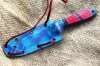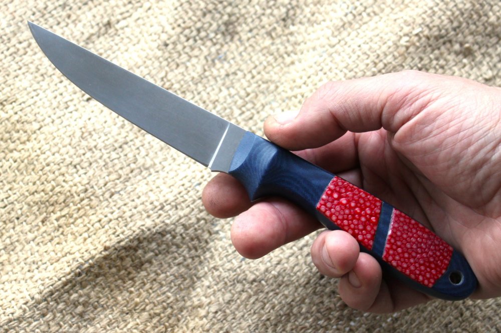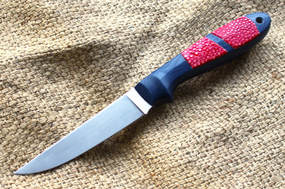 Здравствуйте друзья! Нож в стиле Вилсон. Клинок Х12МФ от Приказчикова. Шлифовал, галтовал. 111-23-3,2мм Заточен на 30гр. Сведение "нежное" 0,3-0,4мм Кромка "сухенькая". Рукоять из джинсовой микарты. Вставки кожа ската. 117-26-23мм Ножны из АБС с моей покраской акриловыми красками.