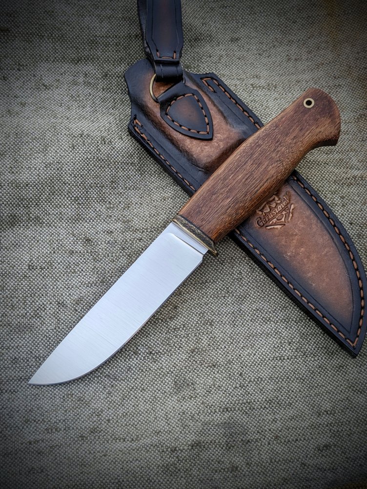 Всем привет. Сталь н690, клинок 120х29х3,5 мм, рукоять 117 мм из микарты, латуни, темляк из паракорда с бусиной, ножны кожа.