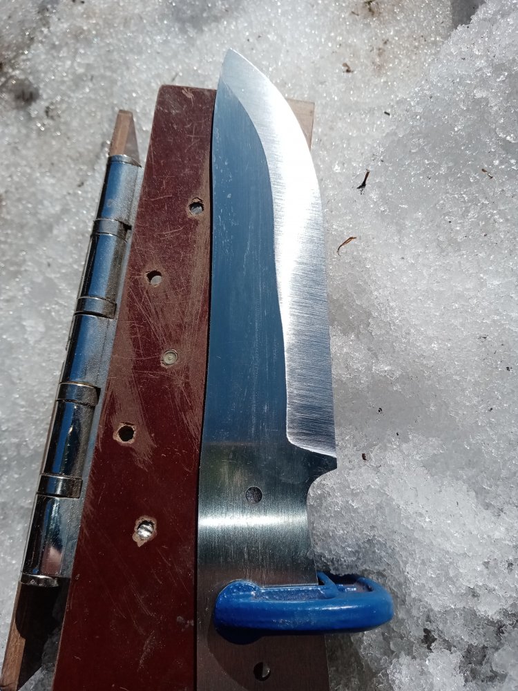 Длина клинка по обуху 178 мм, толщина клинка у больстера 2 мм, к острию на слабый клин, ширина клинка 38 мм, спуски от обуха слабой линзой почти в ноль финиш клинка поперечный сатин, клинок заточен на общий угол 36 градусов.