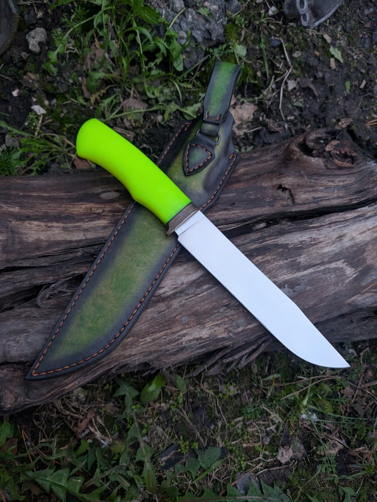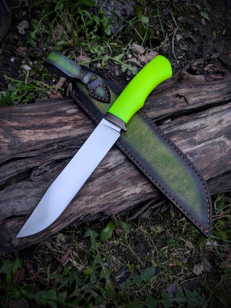 Всем привет. Сталь х12мф, клинок 190х33х4 мм, рукоять 120 мм из микарты, формованные ножны из итальянской кожи растительного дубления.