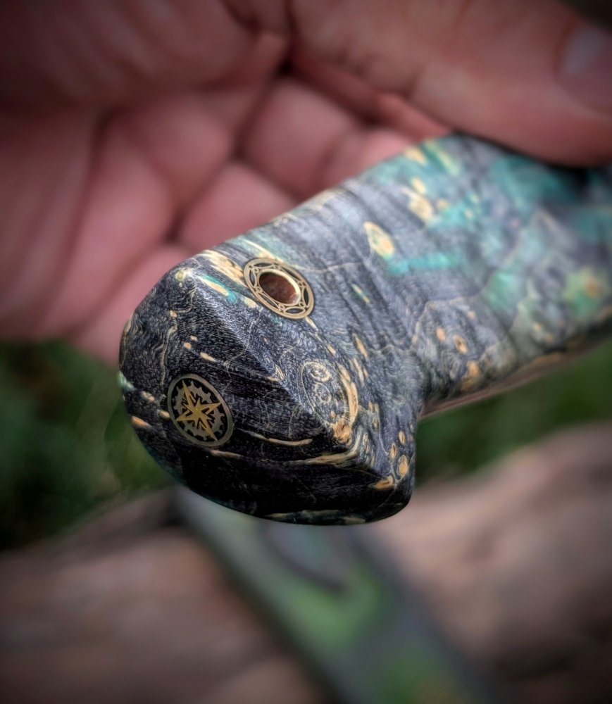 Всем привет. Сталь М398, клинок 125х30х3,5 мм, рукоять 120 мм из стаб капа ольхи, карбона, латуни, нейзильбера, ножны из кожи. PXL_20250802_095526983.jpg PXL_20250801_152913812~2.jpg