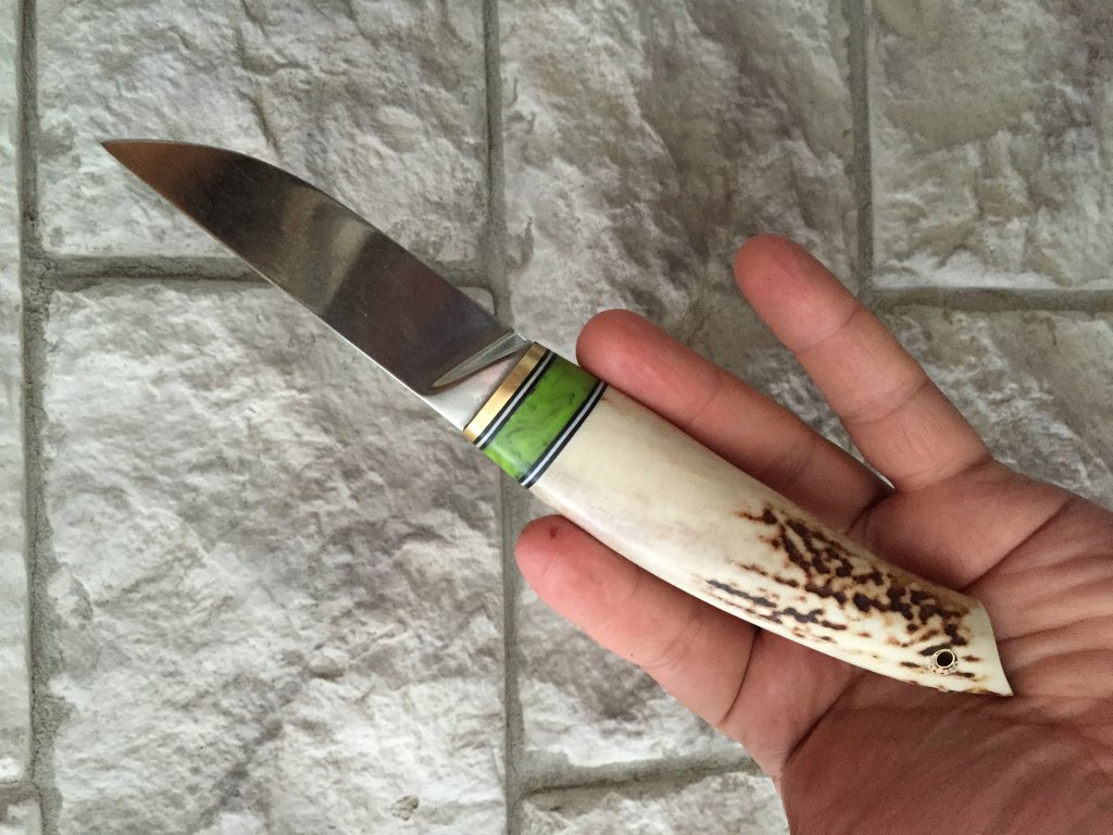 Рог тяжело,холодно и скользко.Вопрос -зачем?И кстати рано или поздно обязательно лопнет.У меня один нож двадцать лет пролежал(даже не в работе) и сука лопнул.