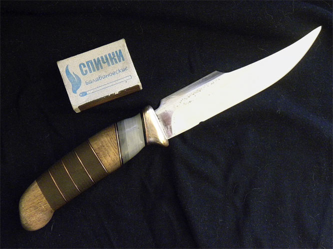 Вот, лет пятнадцать уже со мной. Лезвие 95Х18. Рукоятка - бук, винипласт, медная фольга. Гарда латунная. В ножнах сидит без застёжки. Вынимается свободно. Усилие, как раз, чтоб не выпадал. Для этого толстую кожаную основу ножен (можно ремень) распаривают под горячей водой и зажимают между половинками кожи лезвие в тисках. Губки тисков должны полностью закрывать кожу. Дня два-полтора сохнет. Получаем отпечаток лезвия. Аккуратно обрезаем лишнее и обшиваем тонкой кожей. Замечательно входит-выходит и не выпадает! Говорят, вместо толстой кожи можно использовать толстую "деловую" бересту. Не пробовал.