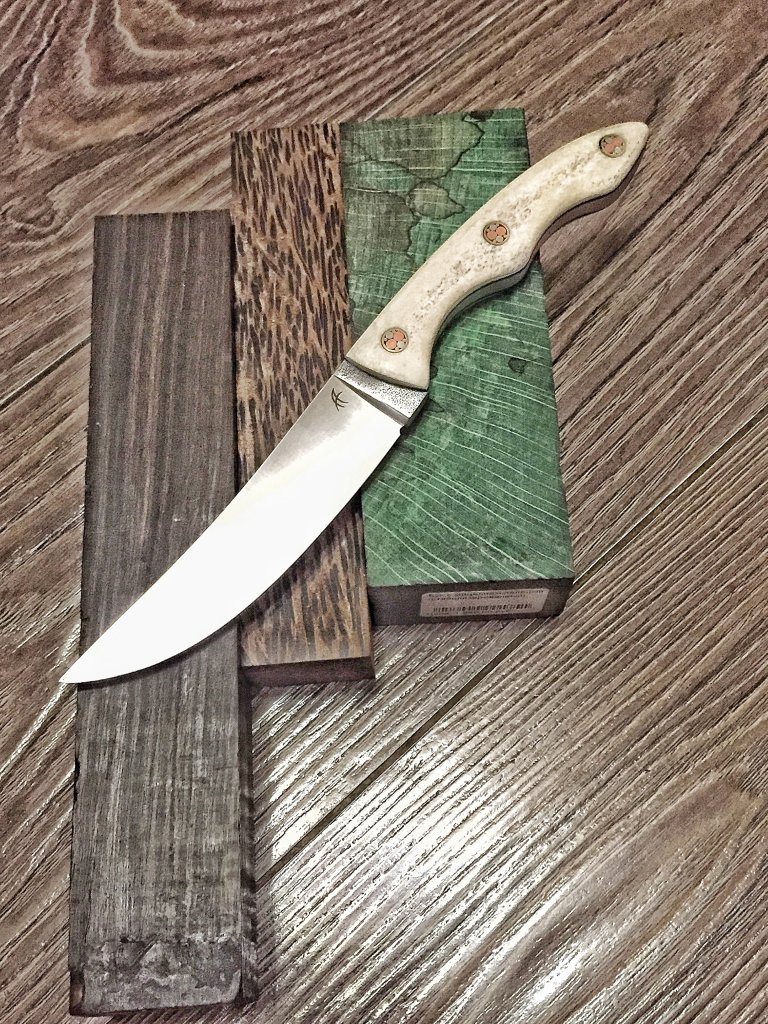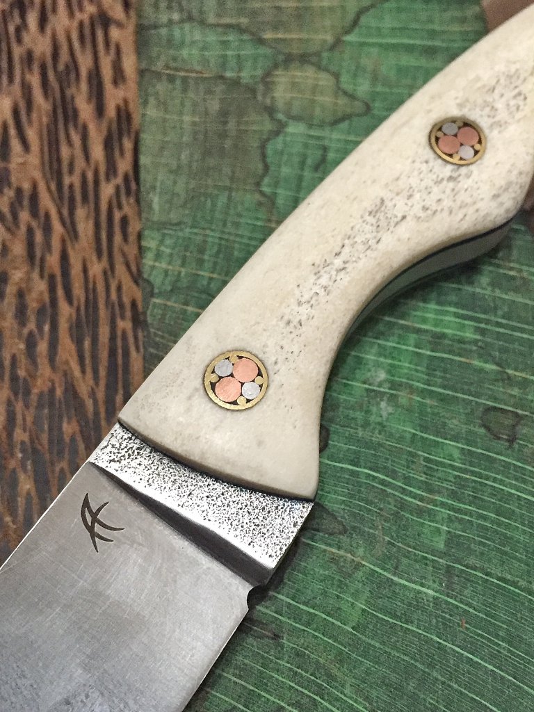 Рукоятка похоже рог?Непонятно как держится за железо и ваши пины(если не ошибаюсь)это чистая декорация или они как клёпки накладки держат.Ну не понятно же.Поясните тёмному.