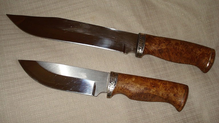 Совершенно верно, ножики для тайги. Сталь оччень твердая 62-64HRS, обушок немного отпущен, дерево березовый кап, пропитка лн масло, лн. олифа.
