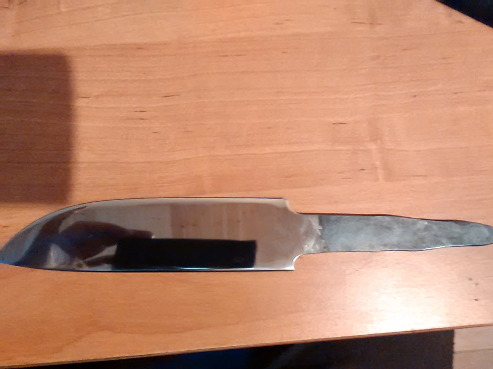 @Sif, Ковка в клин изначально до 1-2 мм на реж кромке. 1)ГДЕ там делать эту линию Рикассо? 2)И нафига она нужна? для красоты? Спуски делаются следующим образом. Кованный и закаленный клинок обтачивается на наждаке. При этом стачивается только около 0,5мм металла. Так как ковка производится на ПОЛИРОВАННОЙ наковальне и ПОЛИРОВАННЫМ молотком-ручником весом 1 кг. Клинок изначально получается гладким. Требует лишь небольшого снятия окалины с неизбежным наклёпом от наковальни и молотка. Наклёп ржавеет но очень тонкий. Таким образом при небольшой обработке даже лимонной кислотой наклёп можно убрать. Вот только забываю я это делать. То есть травить в лимонке нержавейку. Да бывает очень редко чтоб было какое то пятнышко через какое то время при абсолютно мокром клинке. Но оно исчезает быстро. Когда ковкой клинок сведён в клин, облегчается его обработка. Нет нужды снимать 25-50% металла для формирования лезвия. Лезвие уже формируется при ковке. Объяснил как мог. С уважением Николай. Ах да ! Хвост на данном клинке необходимо обработать крупным абразивом типо наждака или подобным. Для лучшей склейки с эпоксидкой. Сразу не обработан так как заляпается и трудно удалить жир из глубоких рисок. Канавки делать не обязательо. Достаточно только легко снять тёмный слой крупным абразивом.