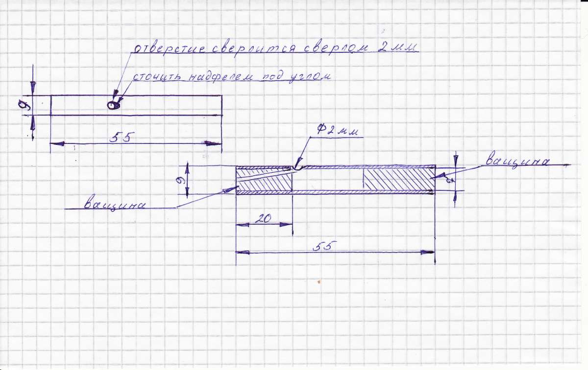 Косточку я беру от гуся из крыла или ноги, самое главное чтобы внутренний диаметр косточки был 7 мм. С одного края отступаем 20 мм. и просверливаем отверстие диаметром 2 мм. После того как просверлили отверстие берем круглый надфиль и стачиваем под углом один край отверстия (на чертеже думаю что понятно). Теперь берём ващину и забиваем один край косточки (со стороны где отмеряли 20 мм.) до отверстия. После этого берем штопальную иголку, только не очень толстую ( я прокалываю металлической пластинкой толщиной 0,8 мм. и шириной 1,5 мм.), и проделываем отверстие в ващине под углом, начиная прокалывать от середины в направлении к отверстию в верх, чтобы игла вышла в отверстие. Теперь попробуйте дунуть в него, если получается свистнуть, то у вас получилось, если нет то пробуйте поменять угол отверстия в ващине или чуть подточить отверстие в косточке.