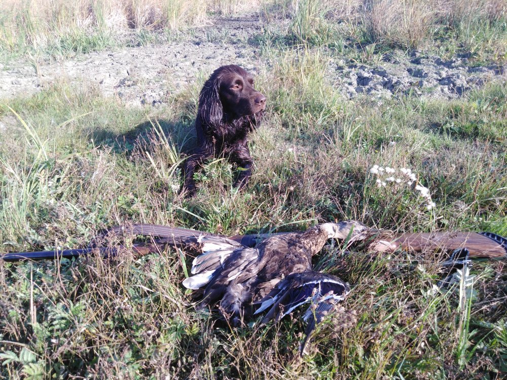 Наверное, это так, но... Мне кажется, если ты не живешь в угодьях и можешь на охоту раз в неделю выбираться, то собаку нужно таскать в поле в первый сезон на любой вид, как только появилась возможность, чтобы "разазартить". Не стоит расписание составлять: в этом году полевая, в следующем утка, а еще через год у ноги будет тихонько сидеть, когда рябчика высвистываешь. Многие дельные советы опытных людей нужно соотносить со своими возможностями. Да и что понимать под работой по утке... Подача стреляной на перелете? Вот выкладываем фото с открытия: утки, собака. И что? Самый интерес, когда собака с подхода пойдет по запаху в камыш и глухо забившегося крякаша выдавит на воду или на подъем. Потом подаст битую (свою личную добычу отдаст хозяину). Вахтелю в этом смысле физика позволяет в этих дебрях работать. Причем если глухо сидит там, где не подойти и не подплыть, выгоняет на воду голосом.
