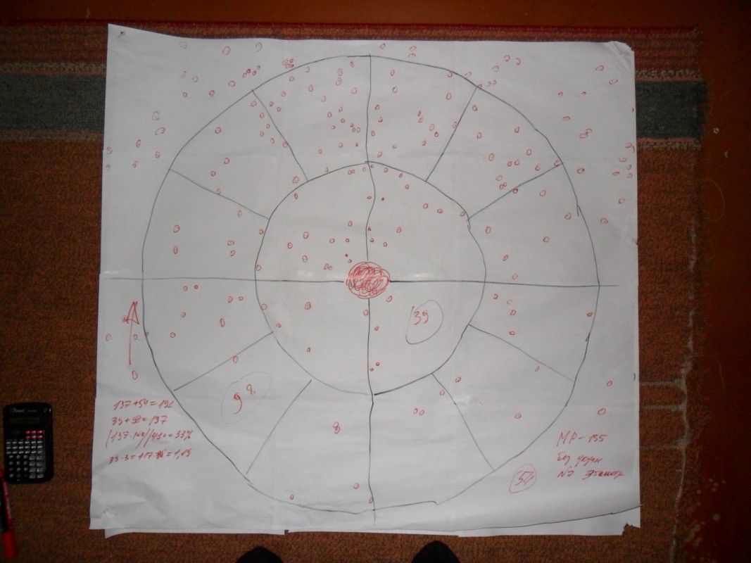 Здравствуйте! Позвольте и мне внести свои пять копеек в Ваш конструктивный диалог. Также призводил отстрел соей 155 в Январе месяце. Дата производства Октябрь 2012. Тоже сложилось впечатление в ходе отстрела, что ружье высит, из за чего пока сказать сложно. Ствол при осмотре прямой. При отстреле дробовая осыпь и пуля, уходят выше точки прицеливания на 30 - 35 см. Стрелял в основном с колена . Расстояние до цели соответственно 35 и 50 метров. Основные результаты отстрела привожу ниже в фотографиях. За качество мишени прошу сильно не пинать Мишени на фото стоят так как стояли при отстреле.