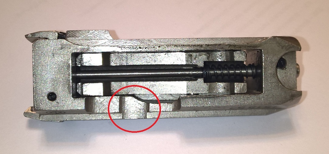 В затворе появилась проточка, а в рукоятке выступ. Теперь рукоятку можно вытащить только в определенном положении затвора, относительно затворной рамы. При желании можно купить рукоятку нового образца и проточить затвор самостоятельно, ничего сложного там нет.