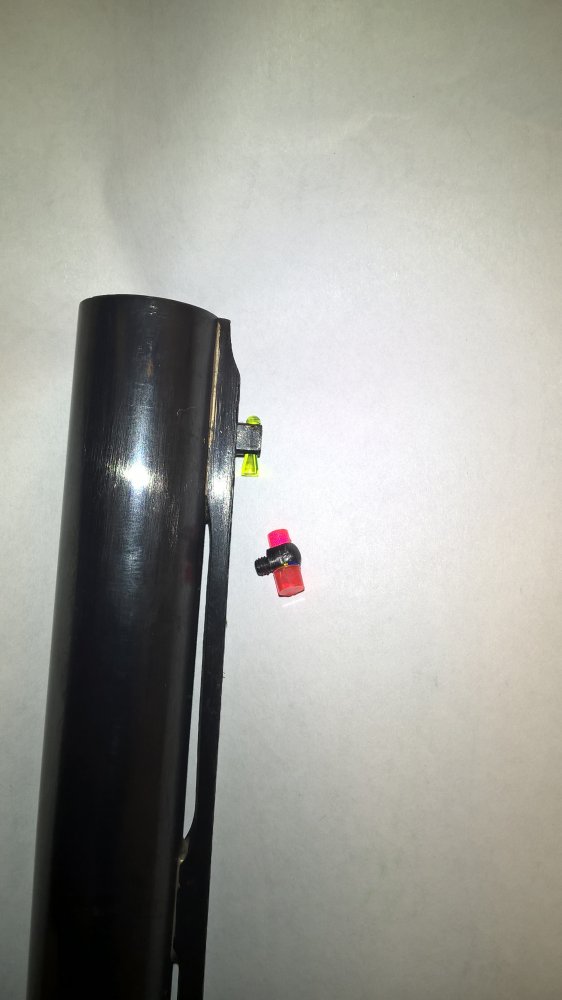 Поставил мушку хайвиз спарк 2. На фото рядом родная, для сравнения. По высоте примерно одинаковы, но у новой габарит волокна меньше и сделана приятно. В выходные протестирую. Кстати, поставил проставку, в субботу двух рябчиков влет четко уложил