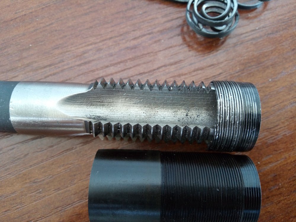 1. Вкручиваем метчик не посредственно в чок. И как сказал представитель завода сила нарезки резьбы больше чем сила прилагаемая на откручивание(это был не мой случай))). Метчик прорезал резьбу на весь чок, в крутил до последнего резца на метчике дальше побоялся задеть ствол.