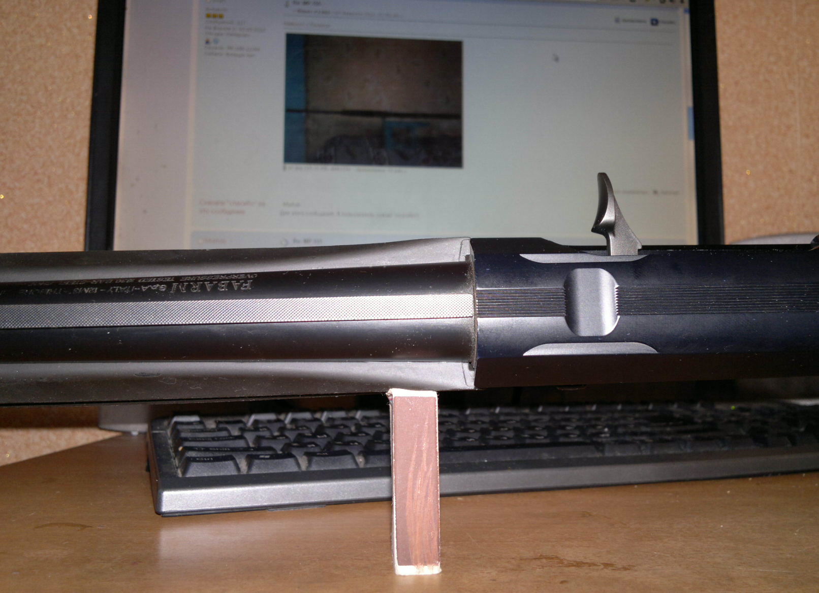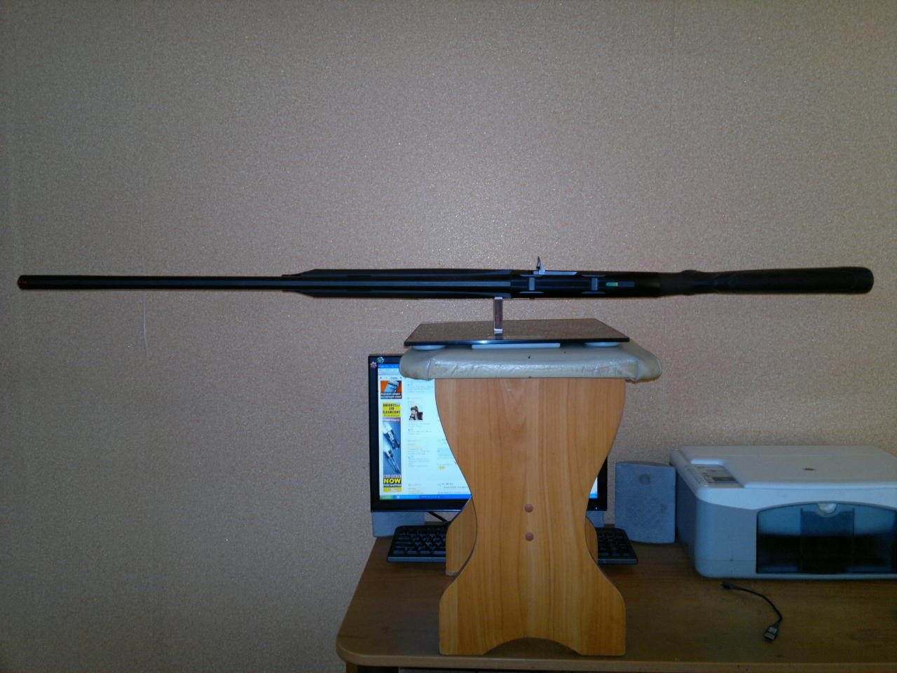 Да ну чё уж... Взрослые ж ведь люди Я, если честно, надеялся что лучше будет. Поверхность цевья там изгиб имеет, не параллельна столу, по этому водрузить ружьё только на спичечный коробок получилось. На всякий случай... (что б "разговоров не было...") фото в полный рост. Кстати, вес ружья = 3220гр.