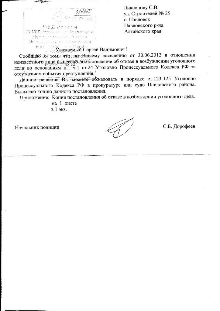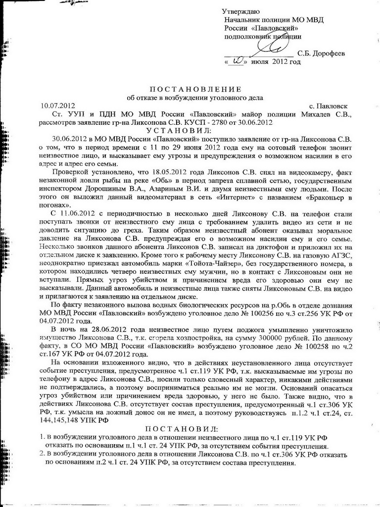 Я ничего другого и не ожидал.За угрозы откажут,поджог возбудят.Насмешило предложение обратиться в Павловский районный суд. ;)