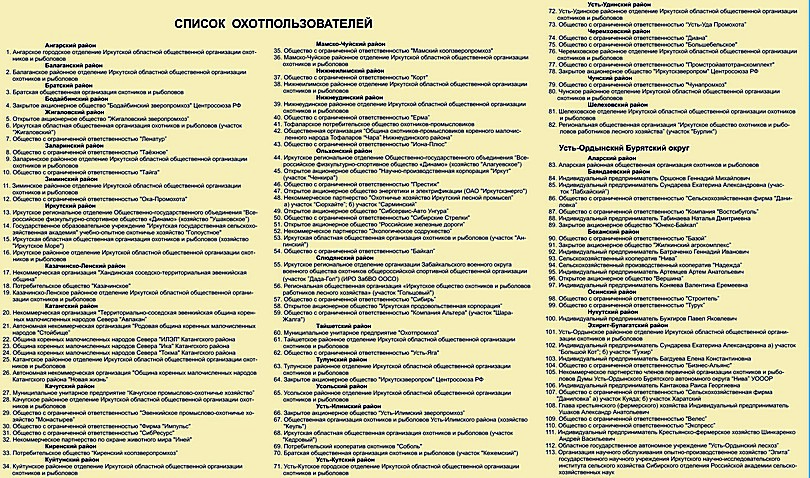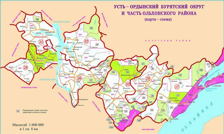А вообще там кроме УОП есть и закрепленные угодья, поэтому ниже на карте лучше посмотреть какой именно участок интересует. Там есть цифры - это отдельный список охотобществ за кем данный участок закреплен(вряд ли он тебе нужен, но если что заинтересовало у меня есть распечатка) , а белым под №33 общедоступные Усть-Орды, а под №29 - Баяндай.