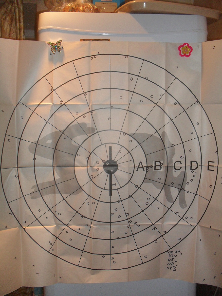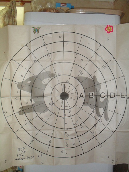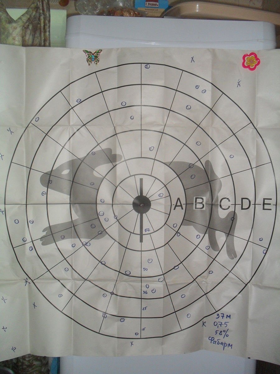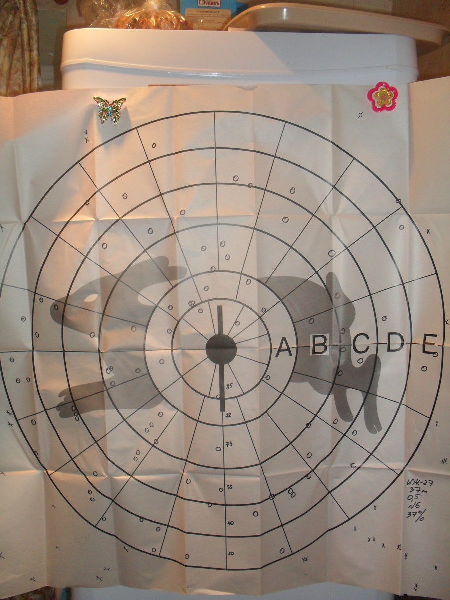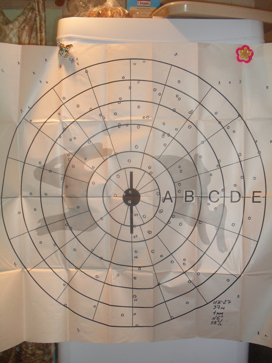 тот же иж-27 только с нижнего(0.5) стрельнули №5 и результат на мишени,52% по сравнению с 37 №6,хочу заметить,что патрончик не то что валовый,а просто заваловый,сунар+двп+дробь,без контейнера...судить вам,хоть и с упора стреляли,но ушло в право в низ,а если бы по центру,то вообще бы красота была