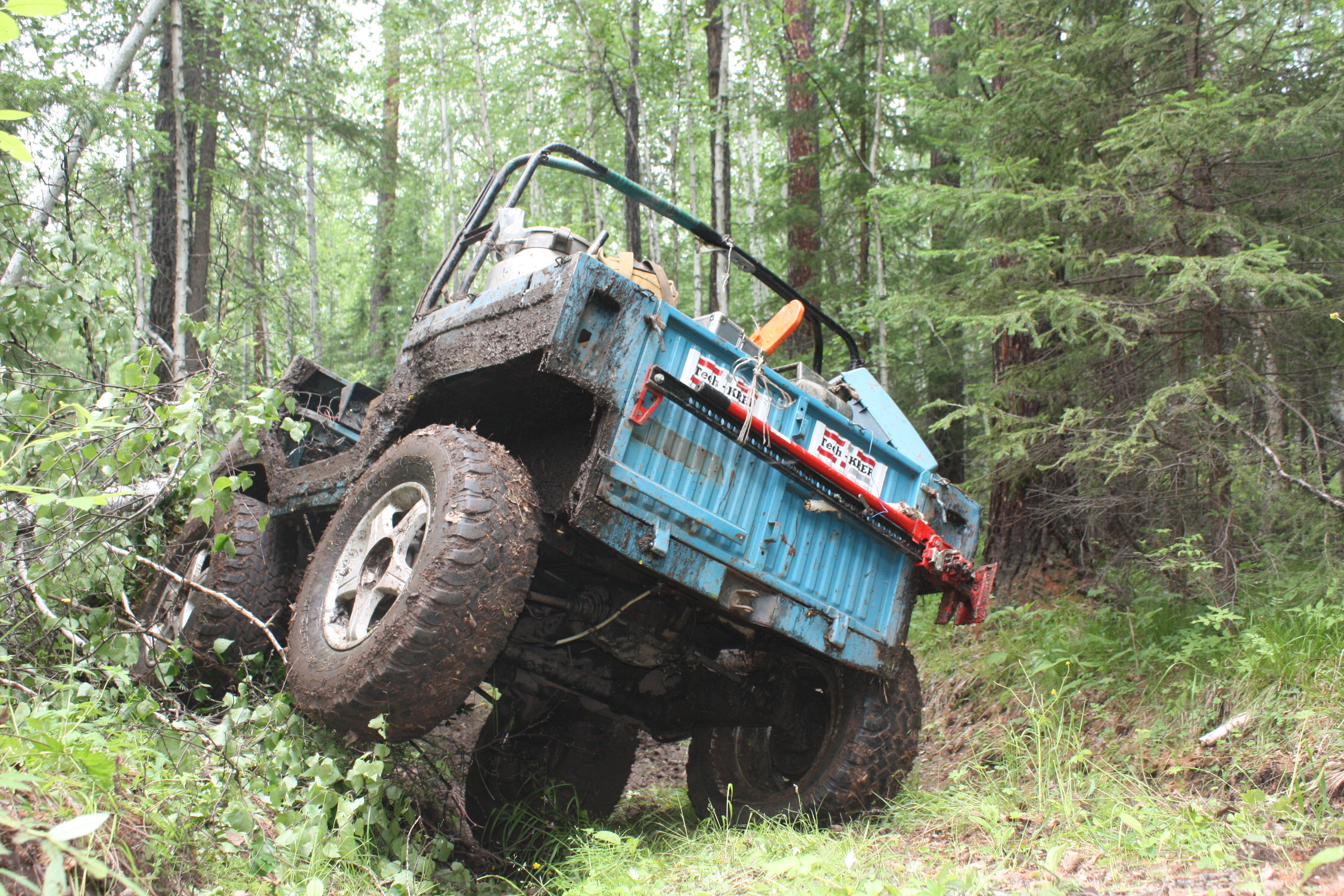 А вот мой луаз. Кратко доработки: укороченный, шестерни в редукторах 2.0, Электрообдув двига из салона(два вентилятора с японки), генератор японский, вынос маслянного радиатора (с вентилятором), 31-резина, максимально облегчен, карб от 213 нивы... Родной двигатель многие меняют, а мне он нравится. Легкий, простой как барабан. Да и разработан немцами. Я поставил зажигание позднее- на низах тянет лучше. Сравнивать с нивами и уазами не стану. А вот с квадром сравню. Аппетит одинаковый. Проходимость почти одинаковая. (Все зависит от резины. Сейчас ищу 30-ю от квадра. Та что стоит- лысая). Вещей везет больше. просвет с 30-й резиной-гигантский. Более ремонтопригоден в тайге. Заводится в любой мороз! Квадр быстрее, маневреннее, легче. в управлении гораздо удобнее.....вообщем стоит пока луаз) Ждет резины. На фото не проверка способности вывеситься- а последствия разговоров за рулем и употребление горячительных....