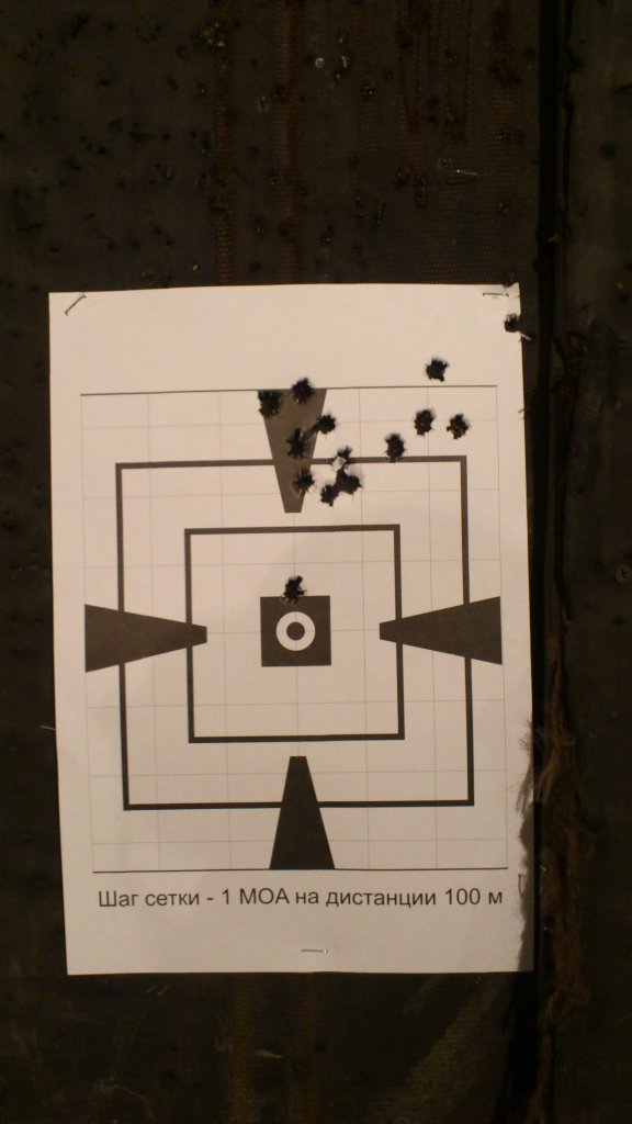 Ну вот побывал в тире, пристрелял коллиматор на 100м... что сказать, точка на 100м перекрывает практически лист формата А4, поэтому целиться пришлось в центр листа ориентируясь по краям. Результат первые три выстрела, почти минута, потом видимо сказалась темповая стрельба и усталость))) стрелял сидя с упора)