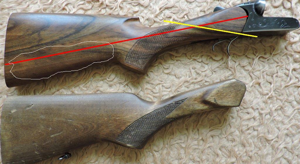 Красная линия - это как должны идти волокна в шейке приклада. Желтая - ориентировочная линия раскола, то что ждет Ваш приклад. Белая область - шейка приклада должна была быть расположена в этом месте. Я бы трижды подумал прежде чем стрелять с этого приклада.